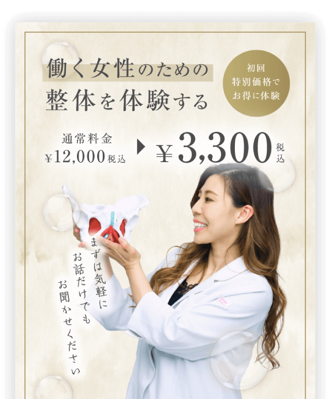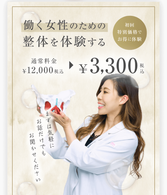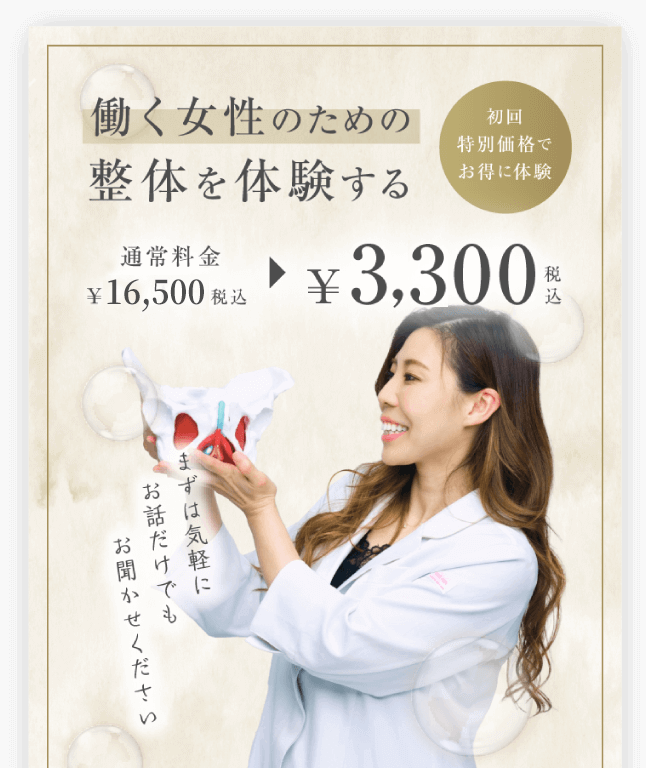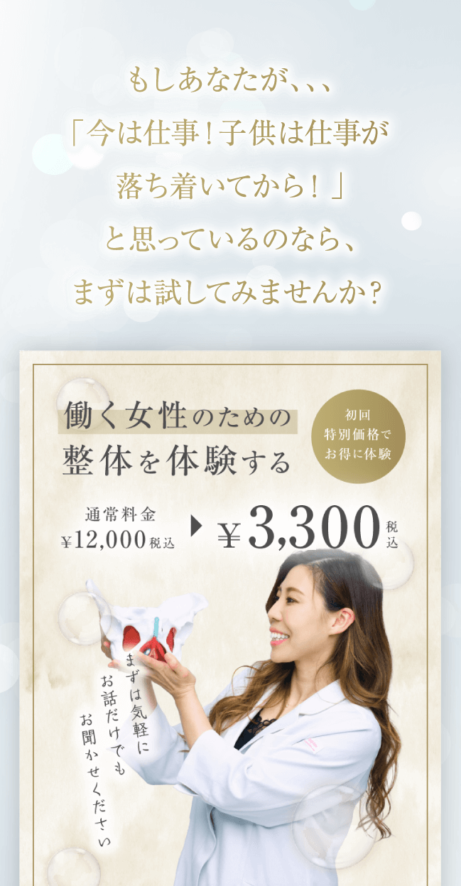 骨盤矯正という言葉はすでに知っている人が多いと思いますが、子宮調整はおそらく 聞き覚えがないと思います。私の施術はソフトなタッチで 子宮を正しい状態に戻し、生理の質を高め、 いつでも授かれるカラダを作ります。