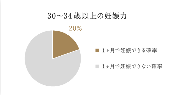 30歳になると徐々に妊娠力が落ちて30~34では20%。確率だけでいえば半年もすれば子供をさずかれる計算です。